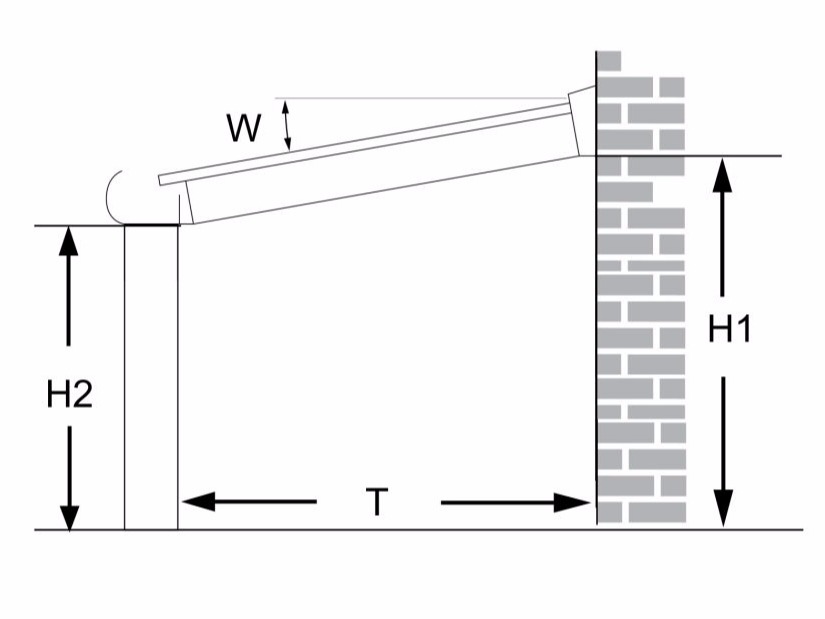 Die optmale Dachneigung (W) einer Überdachung von terrassana beträgt 7° bis 15°. Die Höhe des Wandprofils (H1) und die Durchgangshöhe (H2) sollten aufeinander abgestimmt sein.